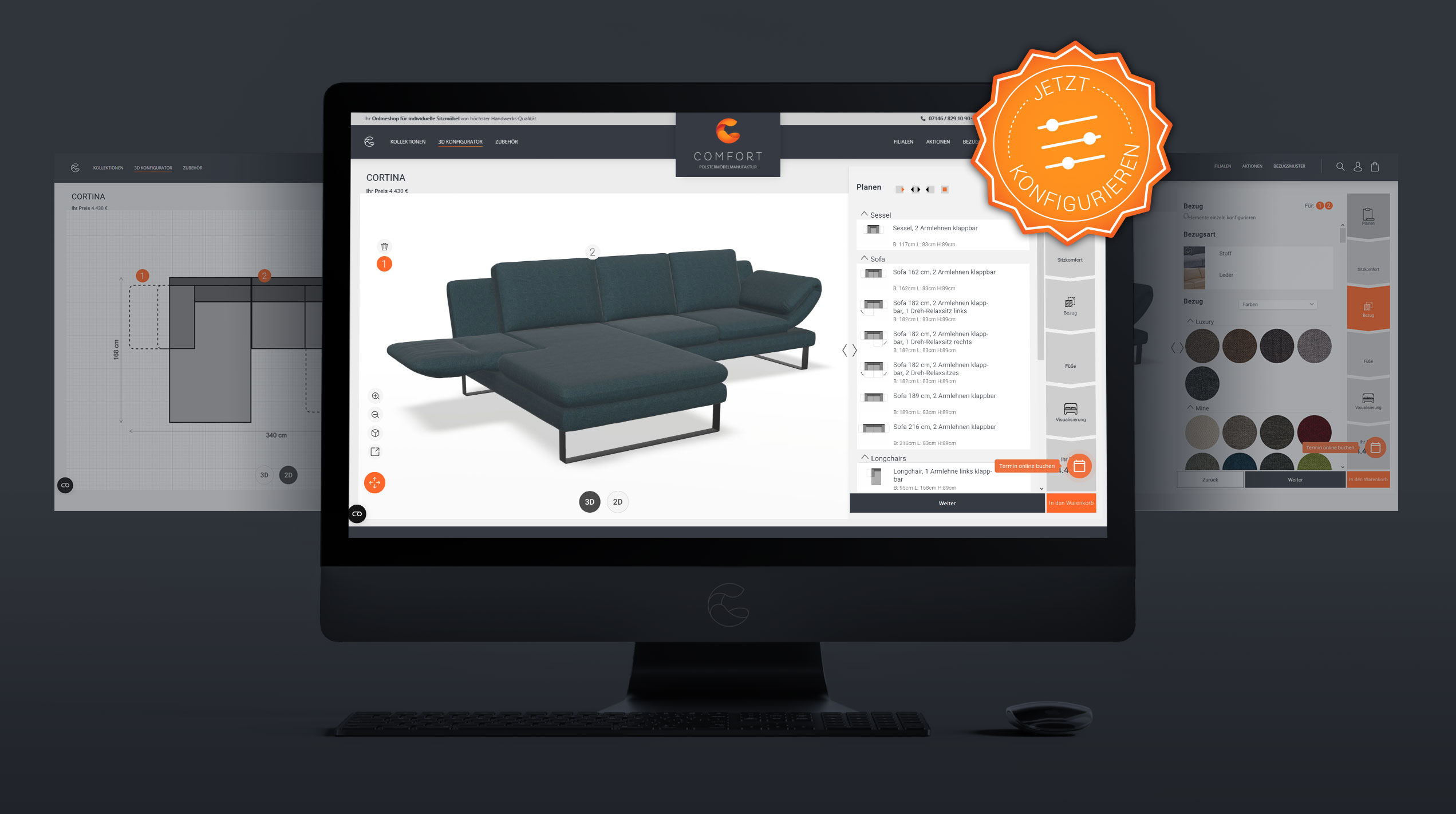 Mit unserem exklusiven Online-Konfigurator können Sie sich Ihr neues Sofa ganz nach Ihren Vorstellungen zusammenstellen. Dabei profitieren Sie von einer Echtzeit-3D Darstellung Ihrer Konfiguration.